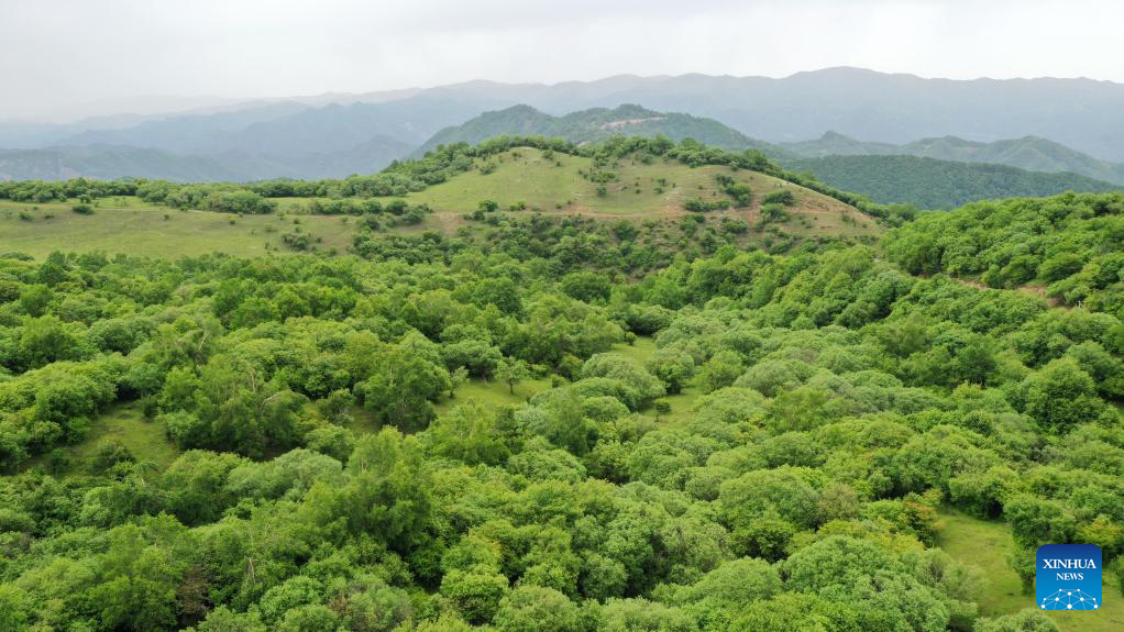 Aerial photo taken on June 7, 2022 shows the view of a forest farm of Guanshan Mountain in Zhangjiachuan Hui Autonomous County of Tianshui, northwest China's Gansu Province. (Xinhua/Chen Bin)