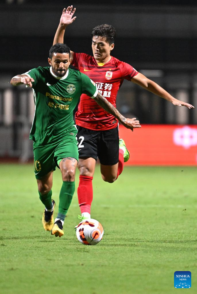 Matheus Leite Nascimento (L) of Zhejiang competes against Li Guangwen of Changchun Yatai during a 2022 season Chinese Football Association Super League (CSL) match between Zhejiang FC and Changchun Yatai FC in Haikou, south China's Hainan Province, June 7, 2022. (Xinhua/Guo Cheng)