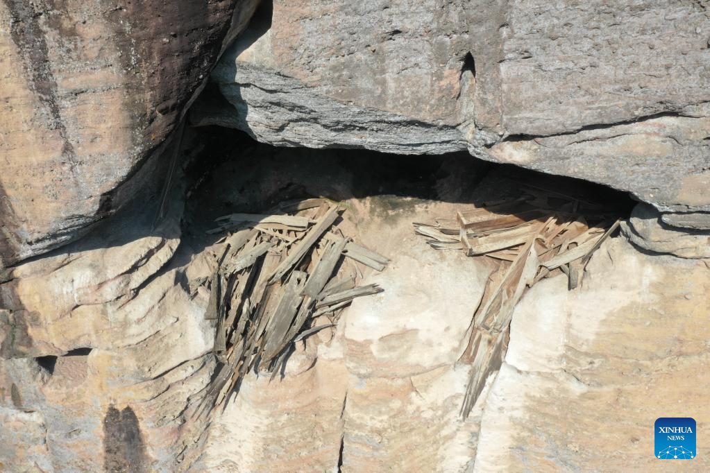 Aerial photo taken on June 6, 2022 shows the ancient relic of a rock shelter with wooden boat coffins of Mount Wuyi in southeast China's Fujian Province.