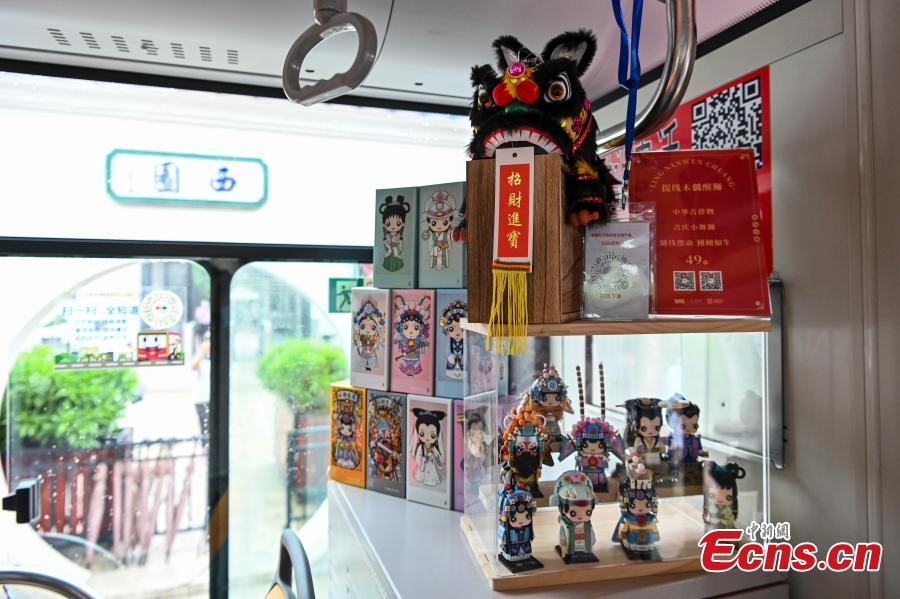 Lion Dance puppets and Cantonese opera toys are placed in the themed bus in Guangzhou, south China's Guangdong Province, June 8, 2022. (Photo: China News Service/Chen Jimin)