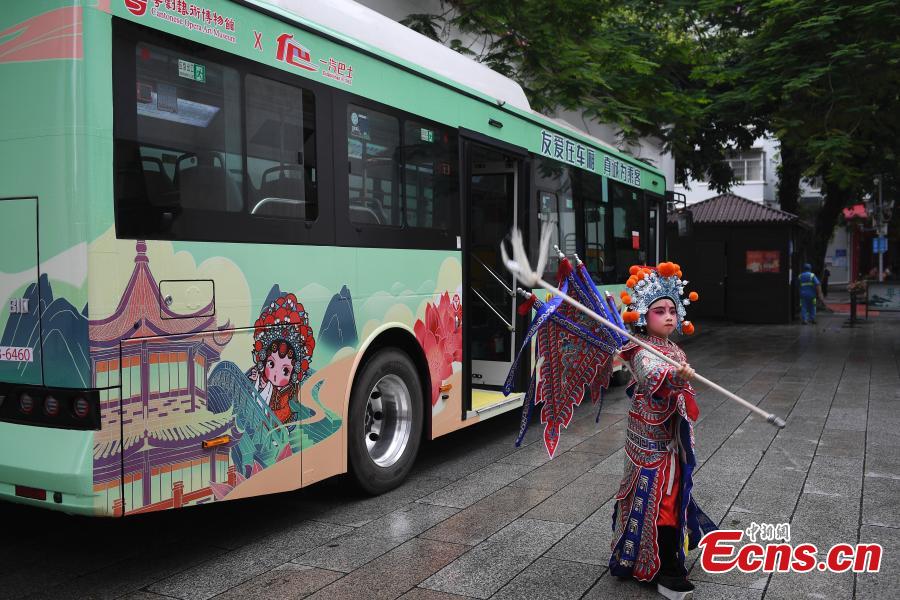 A kid performs Cantonese opera in front of a themed bus in Guangzhou, south China's Guangdong Province, June 8, 2022. No 8, a Cantonese opera themed bus route was officially launched in Guangzhou on Wednesday. (Photo: China News Service/Chen Chuhong)