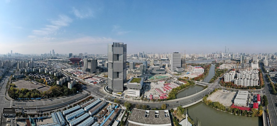 Aerial photo taken on Dec. 17, 2020 shows a panoramic view of the headquarters building of BRICS New Development Bank in east China's Shanghai. (Xinhua/Fang Zhe)