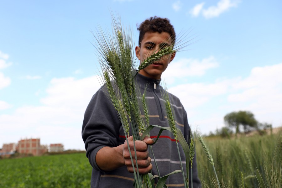 A farmer shows ears of wheat at a field in Qalyubia Governorate, Egypt, March 14, 2022. (Xinhua/Ahmed Gomaa)