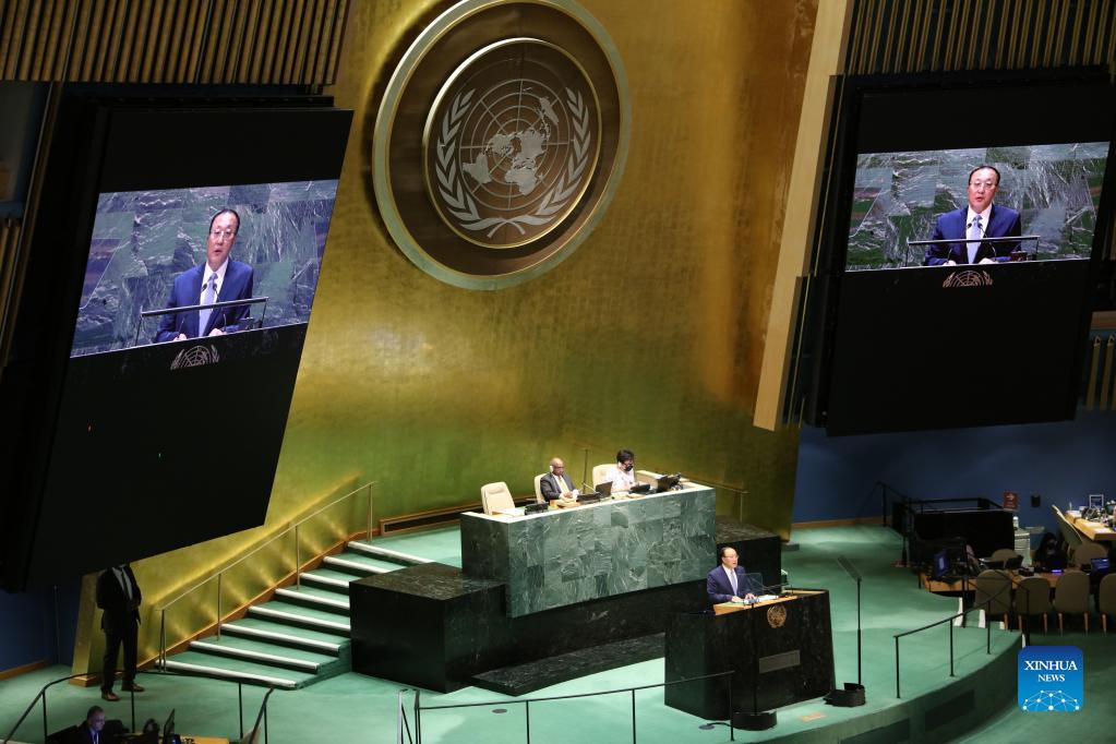 Zhang Jun (at the podium and on the screens), China's permanent representative to the United Nations, speaks at a UN General Assembly debate on the Korean Peninsula issue at the UN headquarters in New York, on June 8, 2022. The Chinese envoy on Wednesday called on the United States to take meaningful, concrete actions to relieve tensions on the Korean Peninsula. (Xinhua/Xie E)