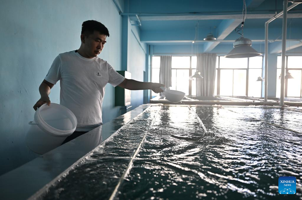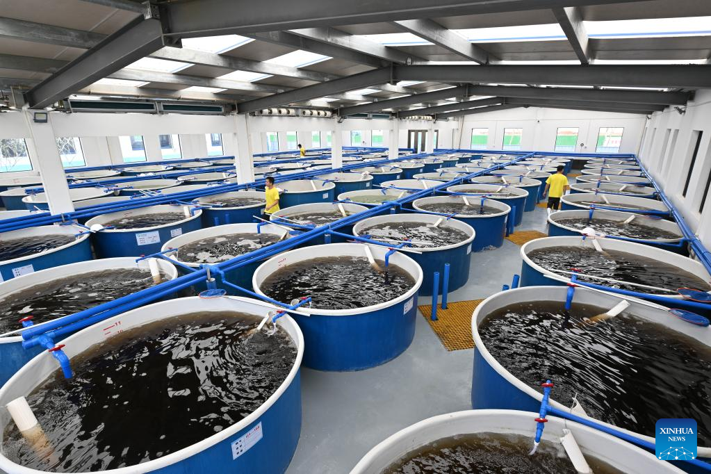 Zeng Guangneng, a fish farmer, feeds fish fry in a breeding demonstration building of Fengjiawan Modern Fishery Industrial Park in Wenchang, south China's Hainan Province, June 1, 2022. (Xinhua/Guo Cheng)