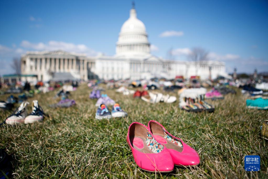 Shoes representing the children killed in school shootings since the Sandy Hook Elementary School shooting in 2012 are seen on the lawn in front of the Capitol in Washington D.C., the United States, on March 13, 2018. (Xinhua/Shen Ting)