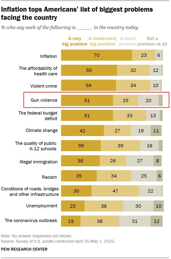 Some 76 percent of Americans see gun violence as "a very big problem" or "a moderately big problem" in the country, according to a Pew Research Center survey carried out in April 2022.