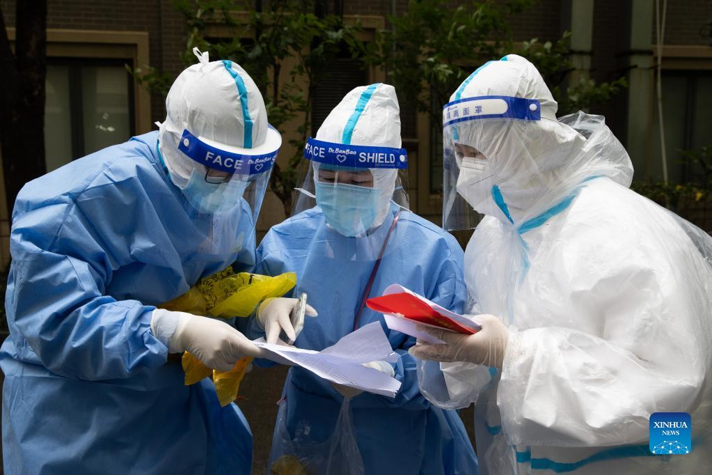 Medical workers check residents' information with a community staff member in Beicai Town of Shanghai, April 26, 2022. [Photo/Xinhua]