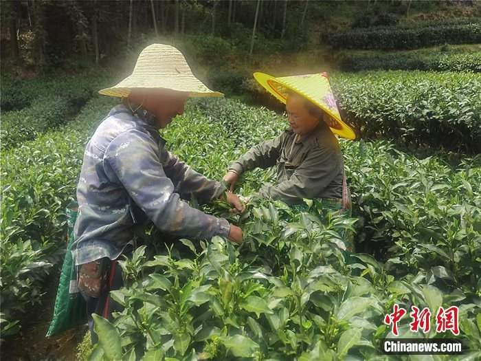 Tea grower Tang Shiming and his wife Huang Funyu pick tea leaves in a tea garden called Bailuke in the Dahong village, Zhenghe county, Nanping city, southeast China's Fujian Province. (Chinanews.com/Zheng Jiangluo)