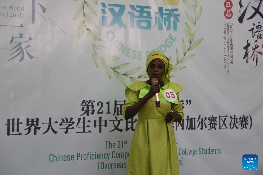 A contestant participates in the 21st "Chinese Bridge" Chinese proficiency competition for Senegalese college students at the Confucius Institute at Cheikh Anta Diop University of Dakar (UCAD) in Dakar, Senegal, June 8, 2022. Ten students participated in the contest organized by the Chinese Embassy in Senegal and the Confucius Institute at UCAD. Under the theme of "One World One Family," the final consisted of three parts: keynote speech, knowledge quiz and talent show. (Xinhua/Wang Zizheng)