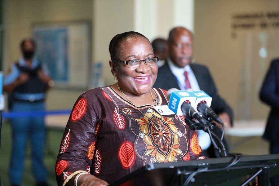 Veronica Macamo, Mozambican Minister of Foreign Affairs and Cooperation, briefs reporters after Mozambique was elected as a non-permanent member of the UN Security Council at the UN headquarters in New York on June 9, 2022. (Xinhua/Xie E)