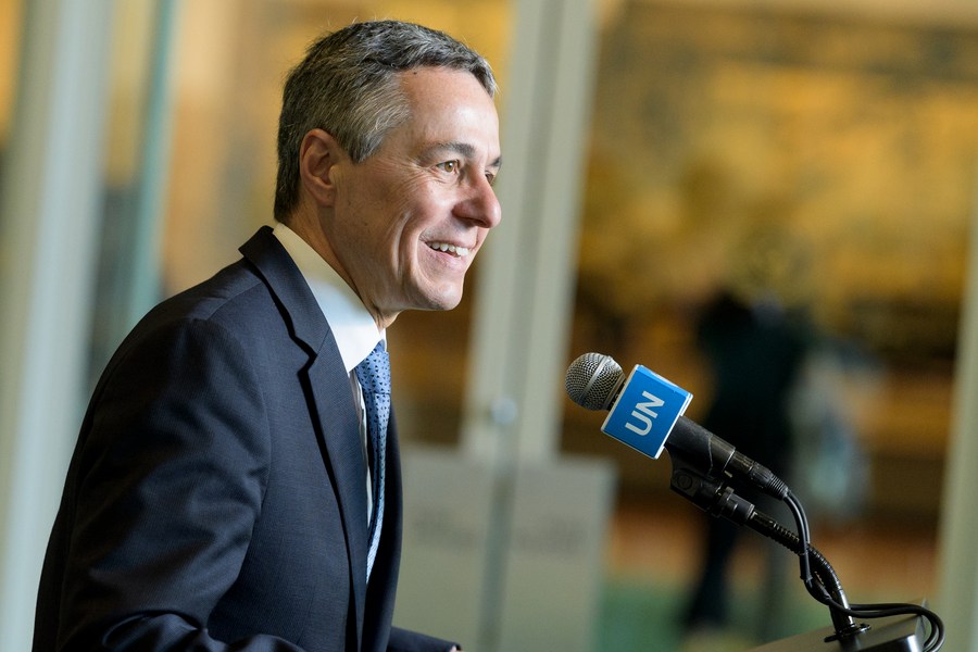 Ignazio Cassis, president of the Swiss Confederation, briefs reporters after Switzerland was elected as a non-permanent member of the UN Security Council at the UN headquarters in New York on June 9, 2022. (Manuel Elias/UN Photo/Handout via Xinhua)