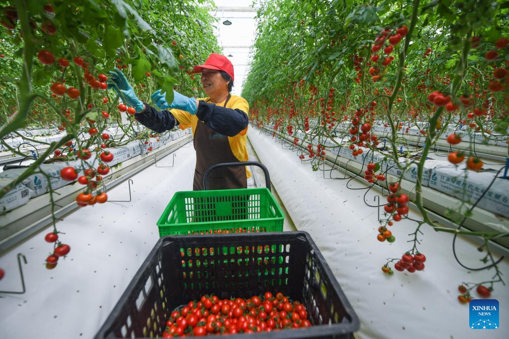 A farmer picks tomatoes at a modern greenhouse in Jiaxing, east China's Zhejiang Province, May 31, 2022.(Xinhua/Xu Yu)