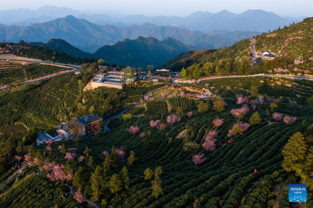 Aerial photo taken on April 8, 2022 shows a tea garden on Anding Mountain of Lishan Town in Fuyang District of Hangzhou, east China's Zhejiang Province. (Xinhua/Xu Yu)