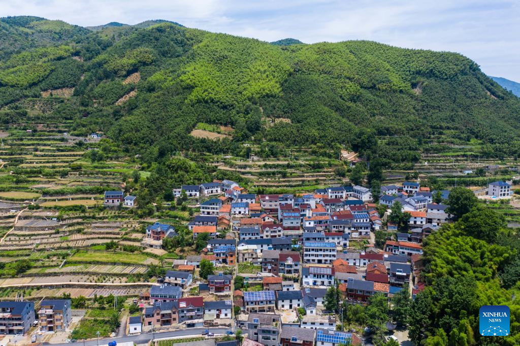 Aerial photo taken on June 7, 2022 shows a view of Longshang Village at Lin'an District in Hangzhou, east China's Zhejiang Province. (Xinhua/Xu Yu)