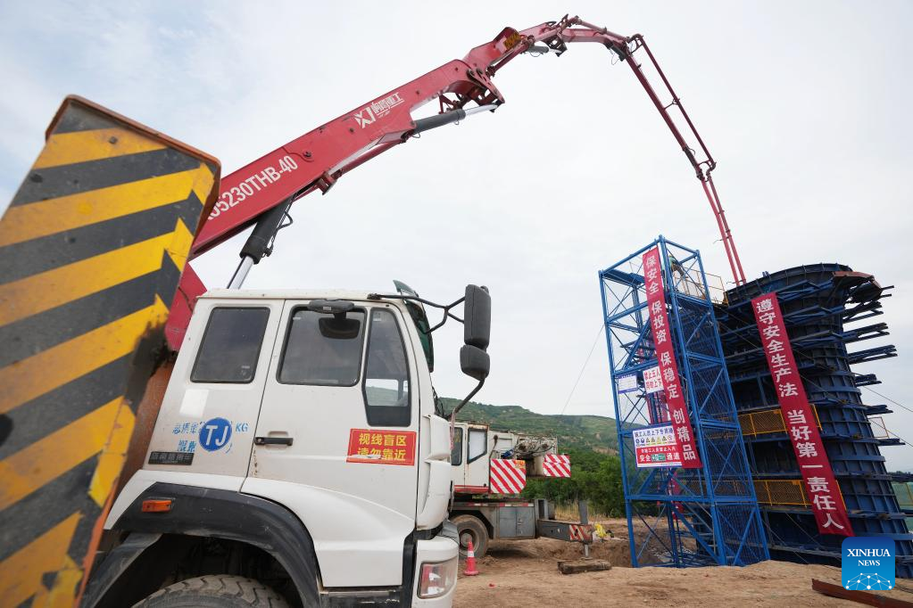 Photo taken on June 9, 2022 shows a pier being concreted at the construction site of the Xi'an-Shiyan high-speed railway in Xi'an, northwest China's Shaanxi Province.
