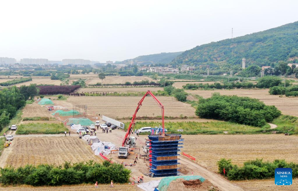 Aerial photo taken on June 9, 2022 shows a pier being concreted at the construction site of the Xi'an-Shiyan high-speed railway in Xi'an, northwest China's Shaanxi Province.