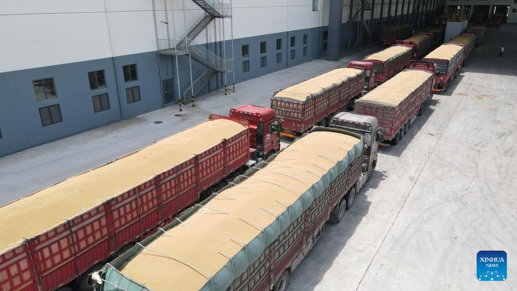 Aerial photo taken on June 7, 2022 shows wheat to be unloaded at a wheat processing factory in Woyang County of Bozhou City, east China's Anhui Province. (Xinhua/Zhang Duan)