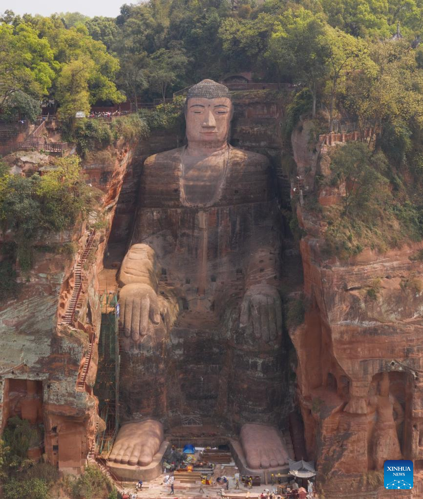 Aerial photo taken on March 29, 2019 shows the Leshan Giant Buddha in southwest China's Sichuan Province.