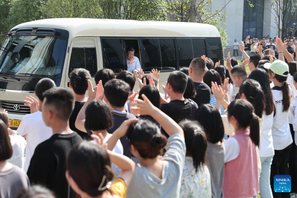Chinese President Xi Jinping, also general secretary of the Communist Party of China Central Committee and chairman of the Central Military Commission, waves to teachers and students while visiting Yibin University in Yibin, southwest China's Sichuan Province, June 8, 2022. Xi made an inspection tour of southwest China's Sichuan Province on Wednesday. (Xinhua/Yao Dawei)