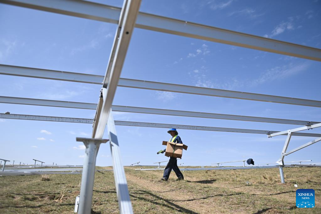 A staff member works at the construction site of a one million kilowatts photovoltaic project in Gonghe County of Hainan Tibetan Autonomous Prefecture, northwest China's Qinghai Province, June 8, 2022.