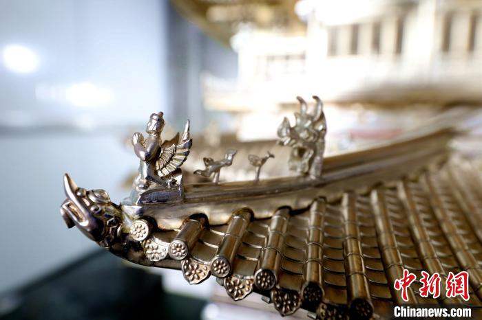 Photo shows a part of the well-designed overhanging eaves of a handmade model of the Tengwang Pavilion created by Chinese craftsman Qian Haiqiang with silver. (Photo/Sha Fei)