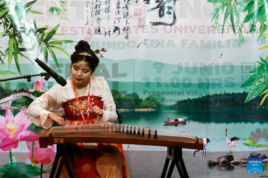 Sofia Fuentes, the first place winner, participates in the 21st "Chinese Bridge" Chinese Proficiency Competition for Chilean College Students at the Santo Tomas University in Vina del Mar, Chile, June 9, 2022. The competition was held at the Santo Tomas University on Thursday. Under the theme of "One World One Family," the final consisted of three parts: keynote speech, knowledge quiz and talent show. (Santo Tomas University/Handout via Xinhua)