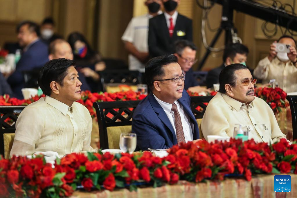 Philippine President-elect Ferdinand Romualdez Marcos (L), former Philippine President Joseph Estrada (R) and Chinese Ambassador to the Philippines Huang Xilian (C) attend the awarding ceremony to Filipinos that contributed to the promotion of the Philippines-China mutual understanding, in Makati City, the Philippines on June 10, 2022. The newly-elected Philippine leader on Friday vowed to foster stronger and deeper Philippines-China relations during his six-year administration. (Photo by Rouelle Umali/Xinhua)