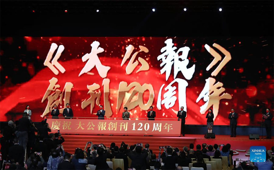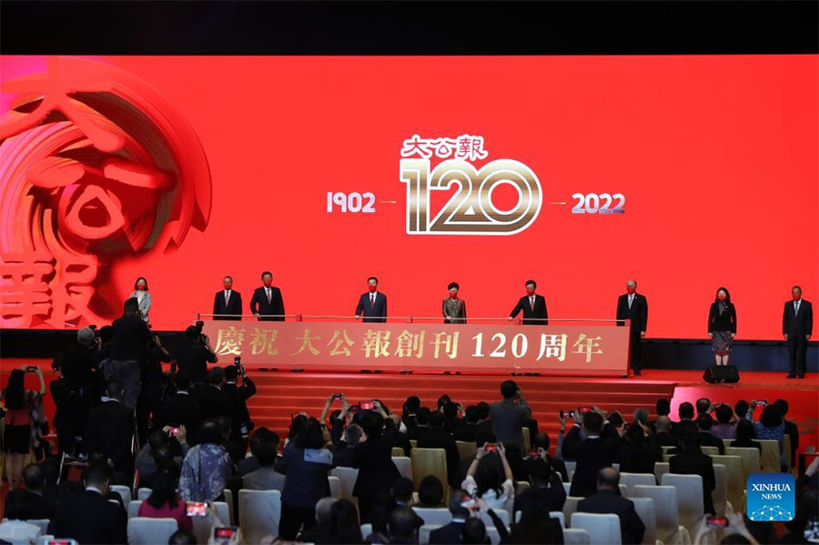 A ceremony marking the 120th anniversary of the founding of Ta Kung Pao, one of the oldest Chinese language newspapers based in Hong Kong, is held in Hong Kong, south China, June 12, 2022. (Xinhua/Li Gang)