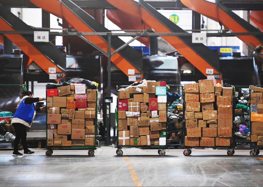 Staff members transport packages at a logistics center in Zhengzhou, central China's Henan Province, Nov. 11, 2021. (Xinhua/Zhang Haoran)