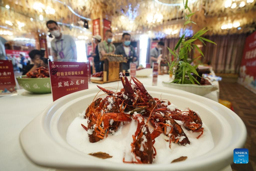 A crayfish dish is seen during an international crayfish festival in Xuyi County of Huai'an, east China's Jiangsu Province, June 12, 2022. An international crayfish festival kicked off Sunday in Xuyi County, a major crayfish base in east China's Jiangsu Province, offering a feast for crayfish fans. The county, with a crayfish-breeding area of 835,000 mu (about 55,667 hectares), sees more than 200,000 people engaged in crayfish-related businesses. (Xinhua/Ji Chunpeng)