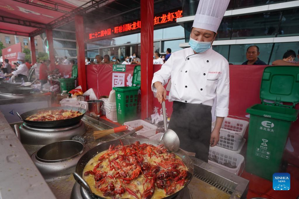 A chef prepares crayfish dishes during an international crayfish festival in Xuyi County of Huai'an, east China's Jiangsu Province, June 12, 2022. An international crayfish festival kicked off Sunday in Xuyi County, a major crayfish base in east China's Jiangsu Province, offering a feast for crayfish fans. The county, with a crayfish-breeding area of 835,000 mu (about 55,667 hectares), sees more than 200,000 people engaged in crayfish-related businesses. (Xinhua/Ji Chunpeng)