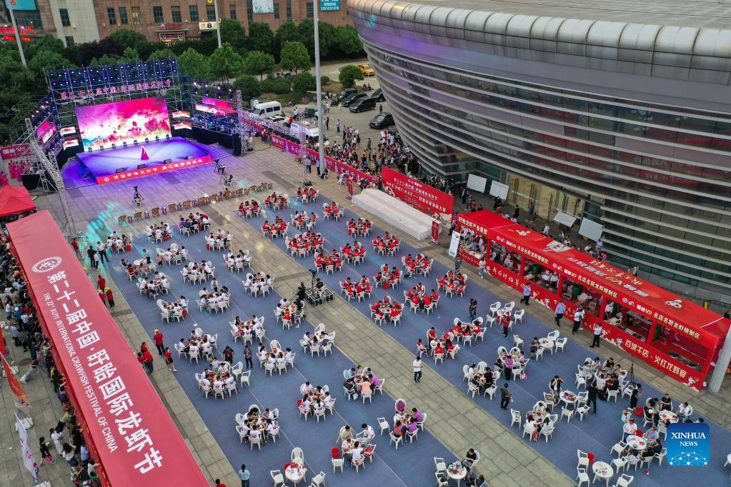 Aerial photo taken on June 12, 2022 shows people enjoying crayfish dishes during an international crayfish festival in Xuyi County of Huai'an, east China's Jiangsu Province. An international crayfish festival kicked off Sunday in Xuyi County, a major crayfish base in east China's Jiangsu Province, offering a feast for crayfish fans. The county, with a crayfish-breeding area of 835,000 mu (about 55,667 hectares), sees more than 200,000 people engaged in crayfish-related businesses. (Xinhua/Ji Chunpeng)