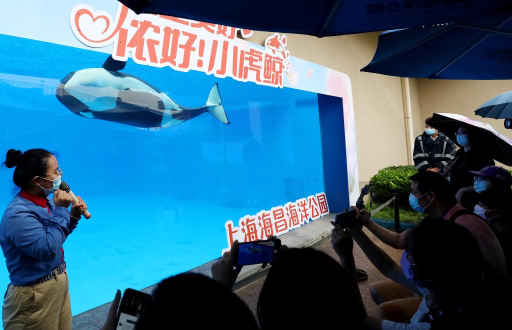 The Shanghai Haichang Ocean Park officially resumed operation on Wednesday, with the total visitor flow capped at 75 percent of the maximum capacity currently. On the same day, a killer whale calf born at the park made its official debut. (Xinhua/Fang Zhe)