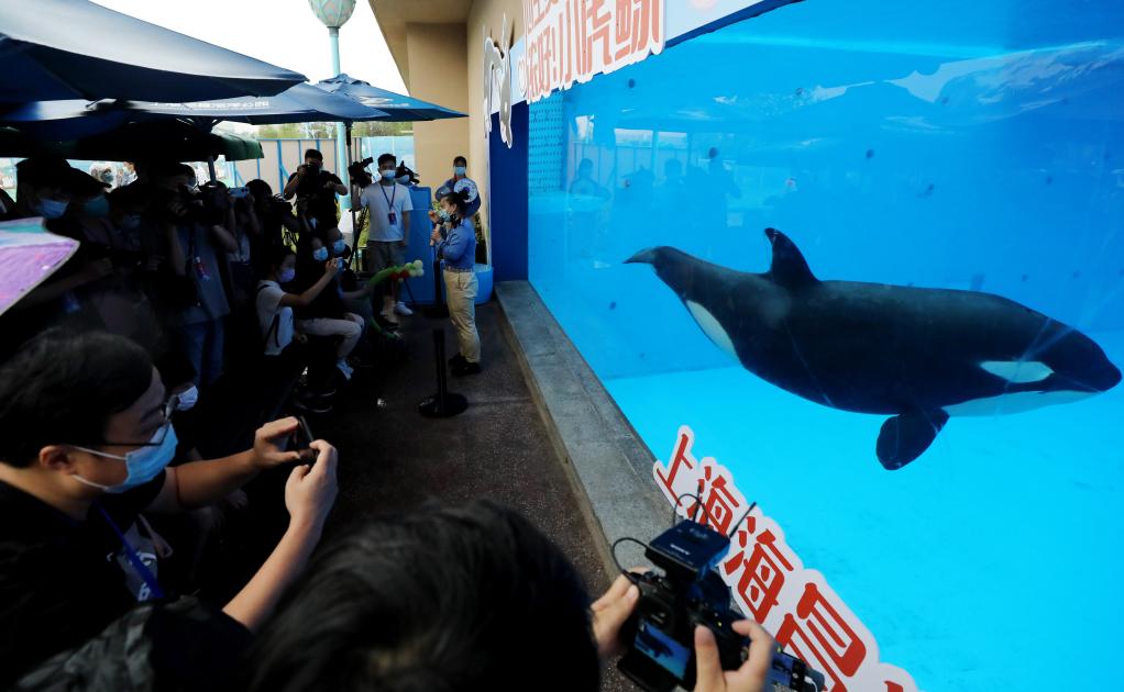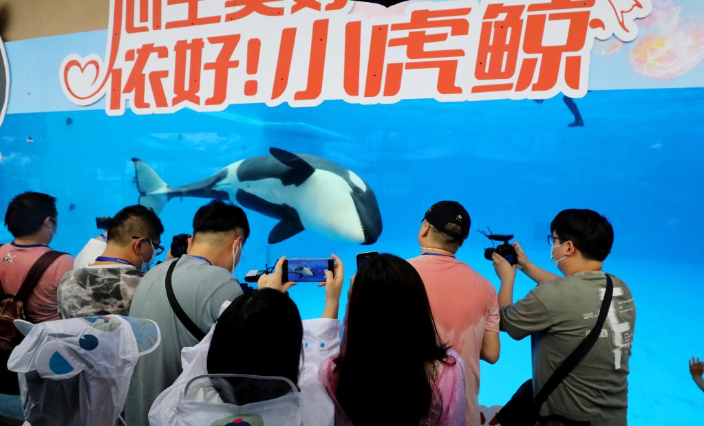 Tourists take photos of a killer whale calf at the Shanghai Haichang Ocean Park in east China's Shanghai, June 12, 2022.