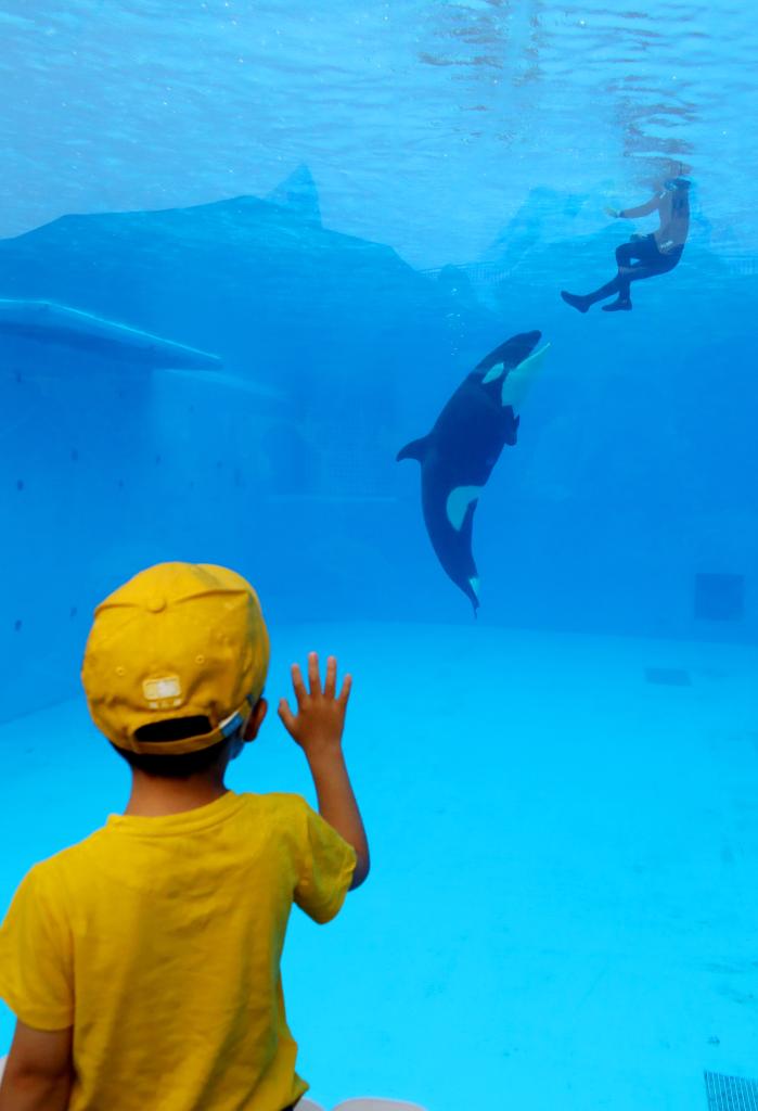 A kid watches a killer whale calf at the Shanghai Haichang Ocean Park in east China's Shanghai, June 12, 2022.