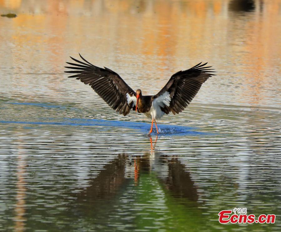 A black stork is spotted in Juma river , Laiyuan county, north China's Hebei Province, June 2022. (Photo: China News Service/Zhang Haibo)