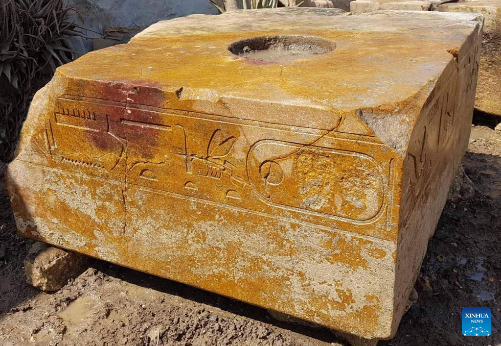 An undated photo shows a block carved with patterns unearthed in Ain Shams area, Cairo, Egypt. An Egyptian-German archaeological mission unearthed granite stone blocks dating back to the era of King Khufu (2589 BC-2566 BC) in eastern Cairo, the Egyptian Ministry of Tourism and Antiquities said Monday. The joint mission also found a piece of granite for King Pepi I Meryre with an inscription of Horus falcon, a pedestal of a statue of King Amasis II and several parts of Sphinx-shaped statues. (Egyptian Ministry of Tourism and Antiquities/Handout via Xinhua)