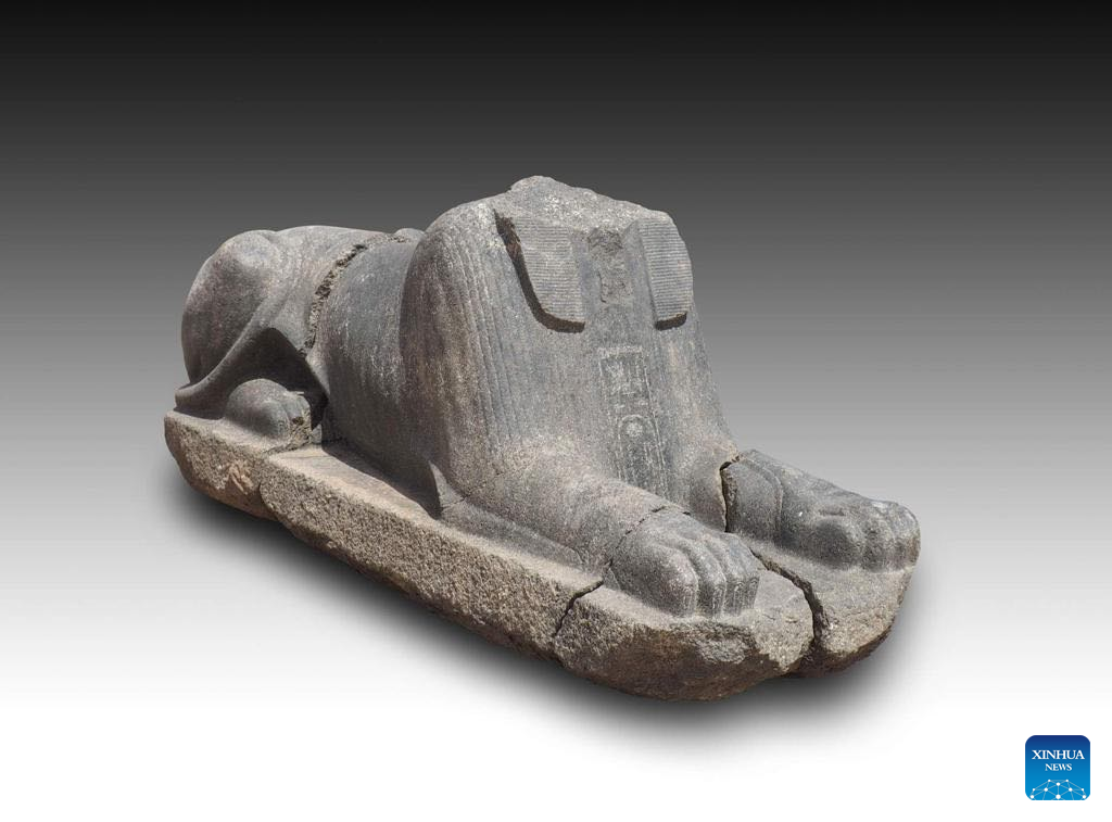An undated image shows an incomplete stone statue unearthed in Ain Shams area, Cairo, Egypt. An Egyptian-German archaeological mission unearthed granite stone blocks dating back to the era of King Khufu (2589 BC-2566 BC) in eastern Cairo, the Egyptian Ministry of Tourism and Antiquities said Monday. The joint mission also found a piece of granite for King Pepi I Meryre with an inscription of Horus falcon, a pedestal of a statue of King Amasis II and several parts of Sphinx-shaped statues. (Egyptian Ministry of Tourism and Antiquities/Handout via Xinhua)