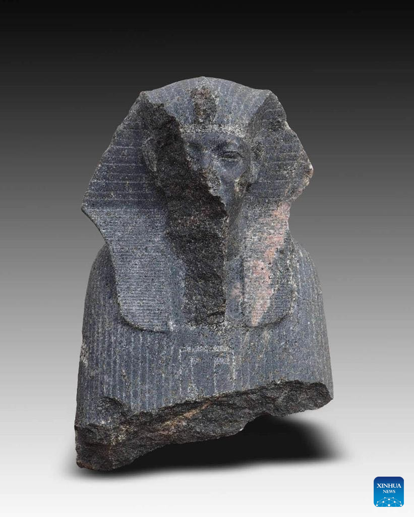 An undated image shows an incomplete stone statue of an ancient Egyptian pharaoh unearthed in Ain Shams area, Cairo, Egypt. An Egyptian-German archaeological mission unearthed granite stone blocks dating back to the era of King Khufu (2589 BC-2566 BC) in eastern Cairo, the Egyptian Ministry of Tourism and Antiquities said Monday. The joint mission also found a piece of granite for King Pepi I Meryre with an inscription of Horus falcon, a pedestal of a statue of King Amasis II and several parts of Sphinx-shaped statues. (Egyptian Ministry of Tourism and Antiquities/Handout via Xinhua)