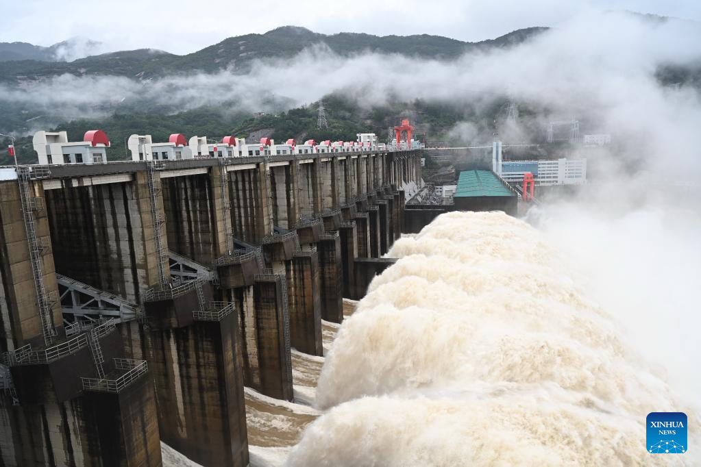 Photo taken on June 13, 2022 shows water gushing out from a gate of the Shuikou Hydropower Station in southeast China's Fujian Province. China's Ministry of Water Resources initiated a level-IV emergency response for flood control on June 12 as heavy rain is expected to sweep the country's southern areas in the coming days. (Xinhua/Lin Shanchuan)