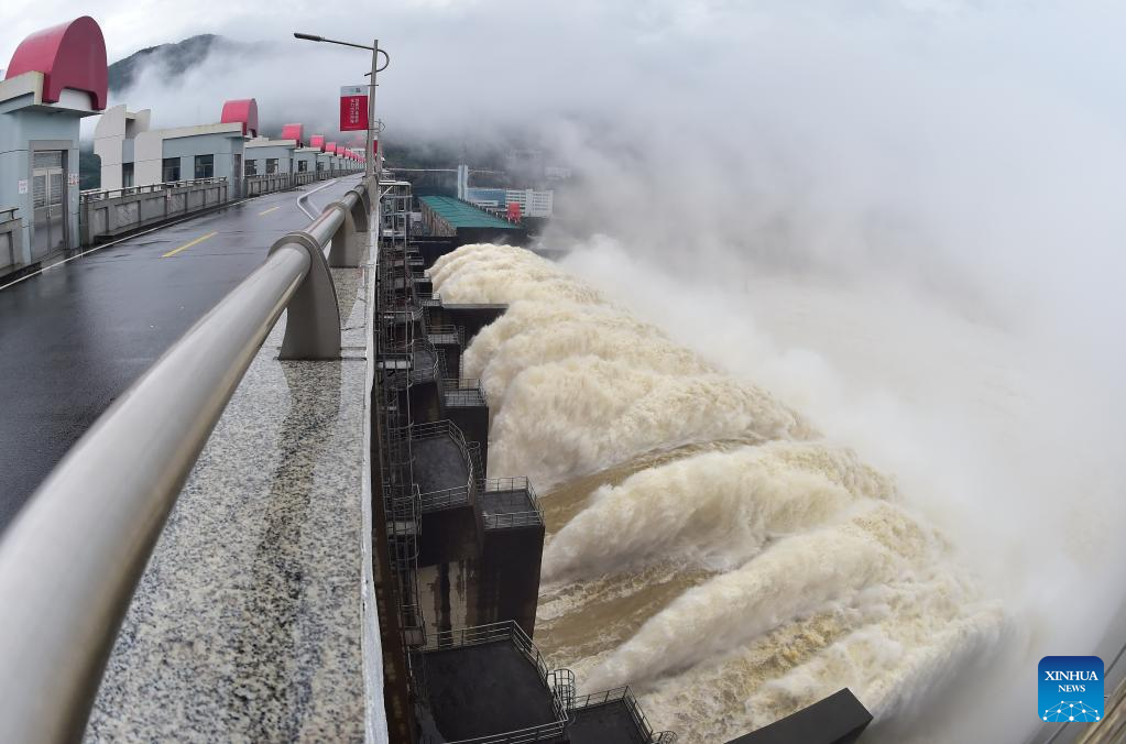 Photo taken on June 13, 2022 shows water gushing out from a gate of the Shuikou Hydropower Station in southeast China's Fujian Province. China's Ministry of Water Resources initiated a level-IV emergency response for flood control on June 12 as heavy rain is expected to sweep the country's southern areas in the coming days. (Xinhua/Lin Shanchuan)