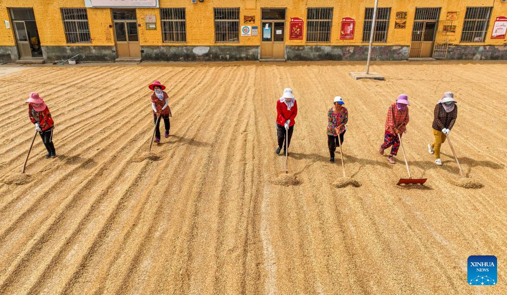 Aerial photo shows villagers drying wheat in Dalijia Village of Shangzhuang Township in Rongcheng, east China's Shandong Province, June 13, 2022. By 5 pm this Monday, Shandong Province, China's second-largest wheat-producing area, had finished reaping winter wheat on 40.223 million mu (about 2.68 million hectares) of farmland, accounting for around 67 percent of its total winter wheat. (Photo by Li Xinjun/Xinhua)