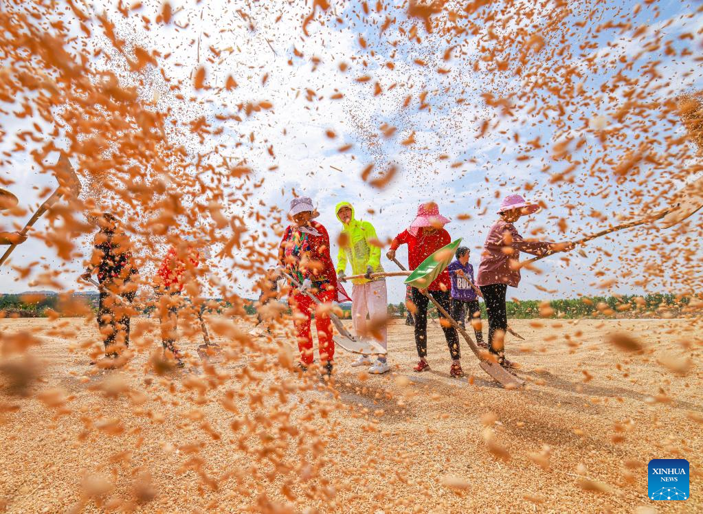 Villagers dry wheat in Dalijia Village of Shangzhuang Township in Rongcheng, east China's Shandong Province, June 13, 2022. By 5 pm this Monday, Shandong Province, China's second-largest wheat-producing area, had finished reaping winter wheat on 40.223 million mu (about 2.68 million hectares) of farmland, accounting for around 67 percent of its total winter wheat. (Photo by Li Xinjun/Xinhua)