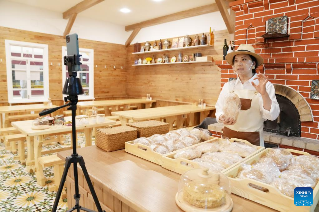 A staff member introduces bakery products on a livestream at Suifenhe Area of China (Heilongjiang) Pilot Free Trade Zone, June 9, 2022. (Xinhua/Wang Jianwei)