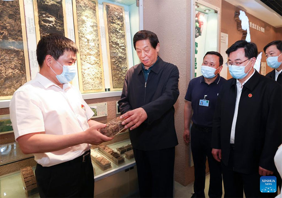 Li Zhanshu, a member of the Standing Committee of the Political Bureau of the Communist Party of China Central Committee and chairman of the National People's Congress Standing Committee, inspects a research institute on chernozem soil conservation in northeast China's Heilongjiang Province, June 12, 2022. Li made a law-enforcement inspection in Heilongjiang Province from June 10 to 13. Led by Li, legislators inspected the province's work in implementing the environmental protection law. They also conducted research for the legislation of a law on chernozem soil conservation. (Xinhua/Pang Xinglei)