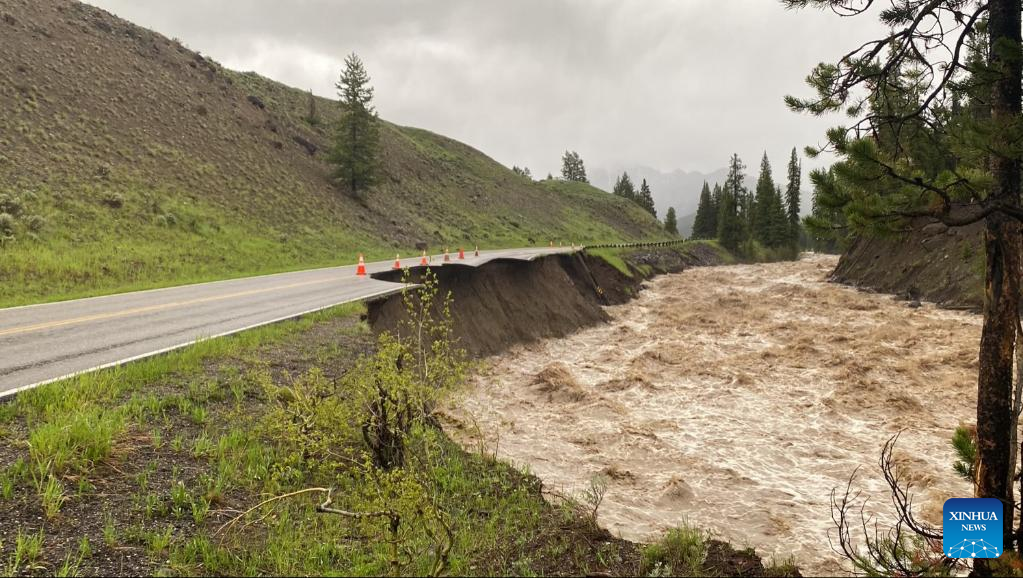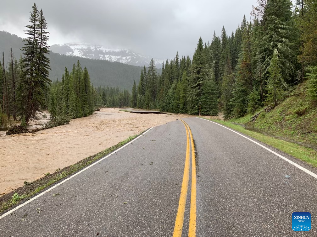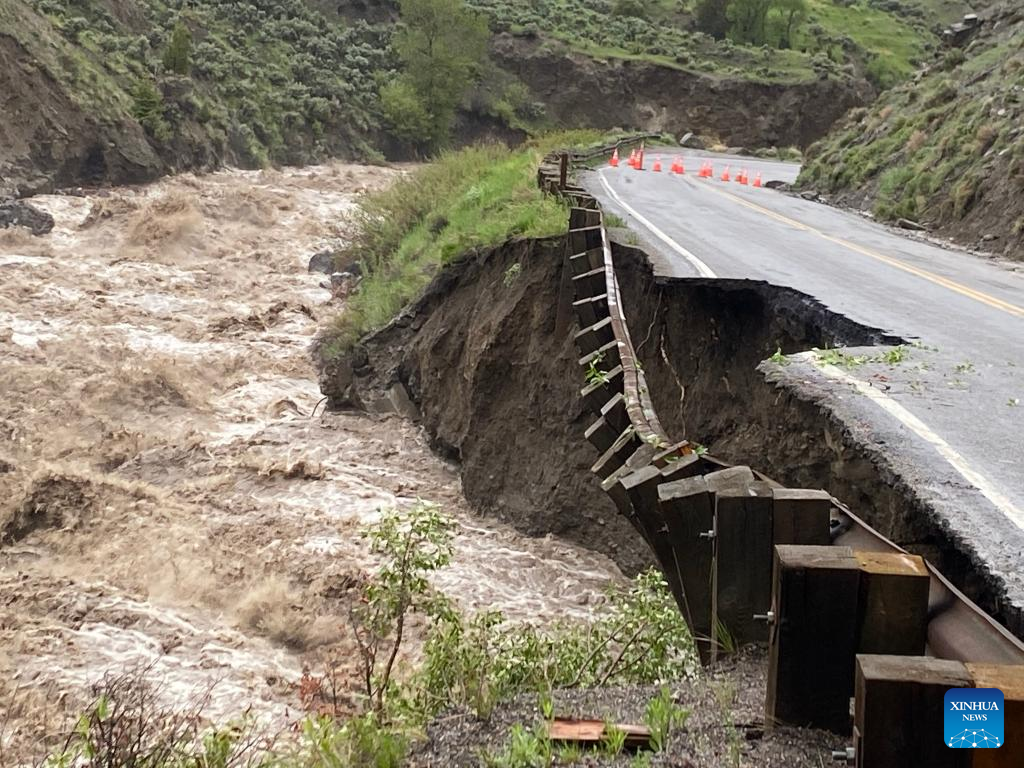 Photo released by U.S. National Park Service on June 13, 2022 shows part of the Yellowstone National Park's Northeast Entrance Road washed out near Soda Butte Picnic Area, the United States. All entrances to the Yellowstone National Park, one of the largest and best-known national parks in the United States, have been closed temporarily due to heavy flooding, rockslides, and extremely hazardous conditions, authorities said. (U.S. National Park Service/Handout via Xinhua)