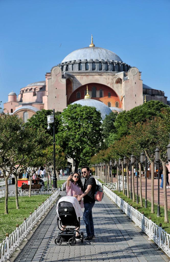 Tourists pose for a photo near Hagia Sophia in Istanbul, Turkey, on June 14, 2022. (Photo by Unal Cam/Xinhua)