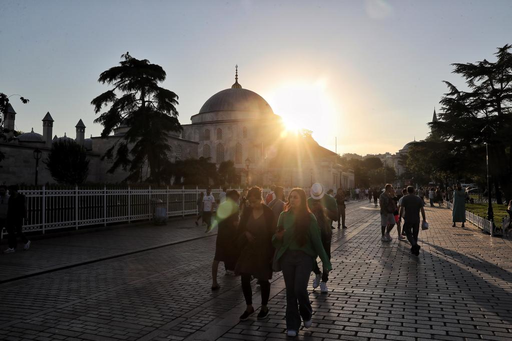 Tourists walk past the Blue Mosque at sunset in Istanbul, Turkey, on June 14, 2022. (Photo by Unal Cam/Xinhua)