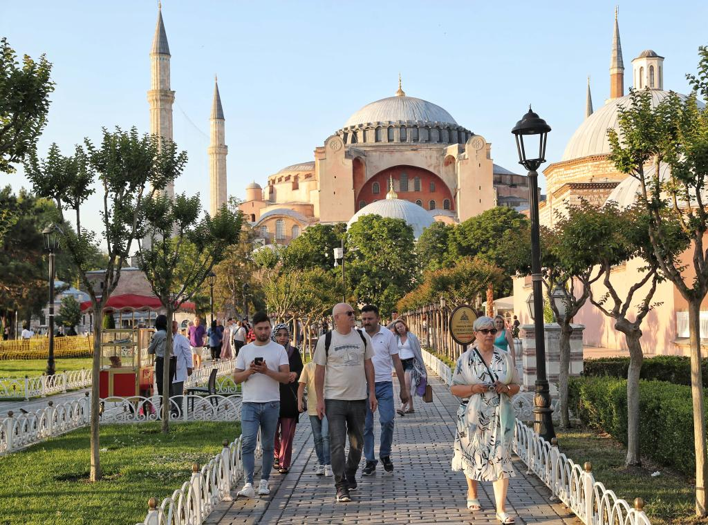 Tourists walk near Hagia Sophia in Istanbul, Turkey, on June 14, 2022. (Photo by Unal Cam/Xinhua)
